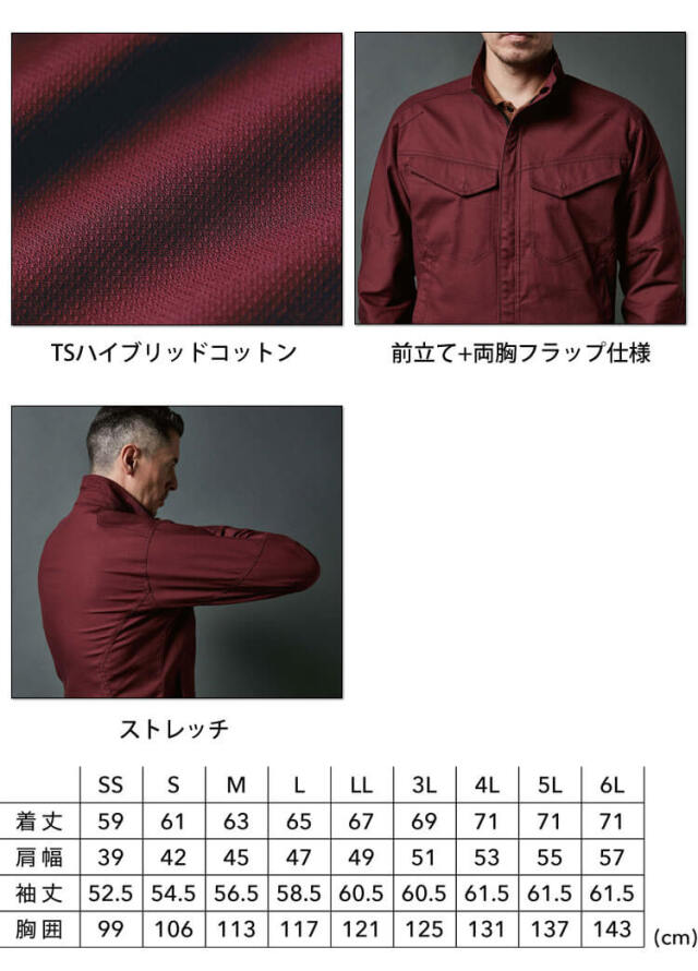 ポリウレタンを使用せずストレッチ性を持たせたTSハイブリッドコットン。綿100%の風合いで耐久性に優れたワークウェア。