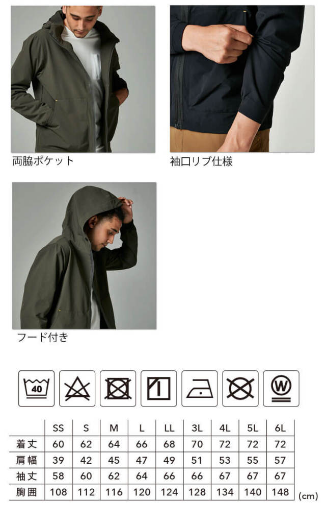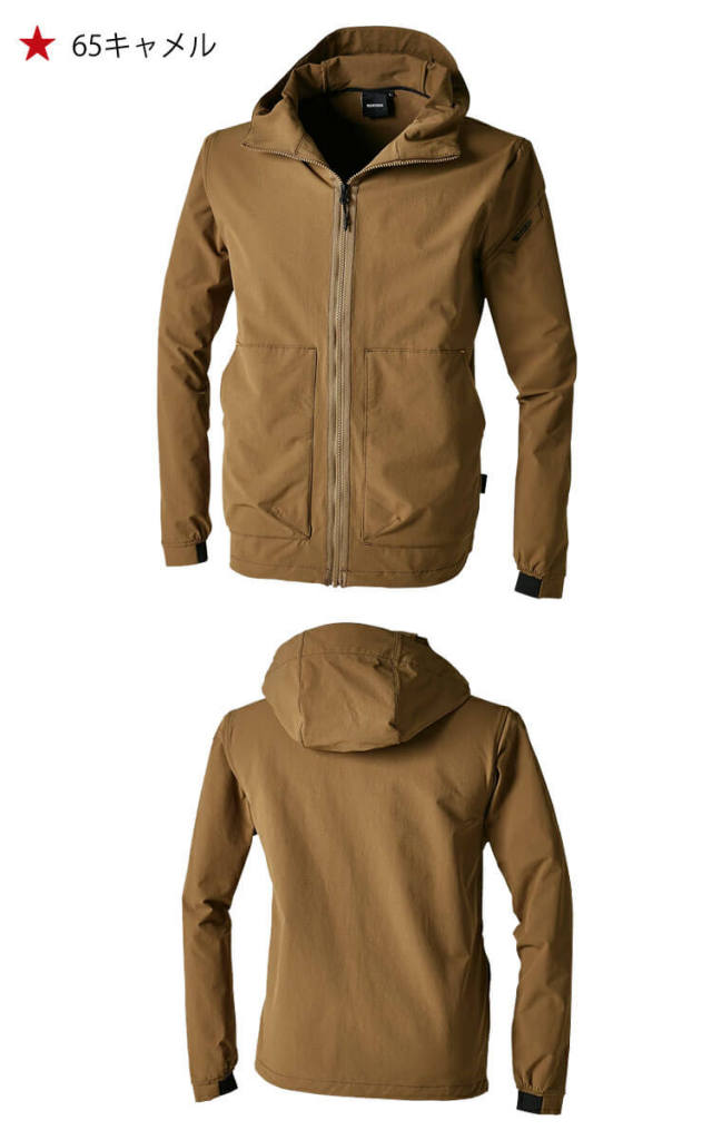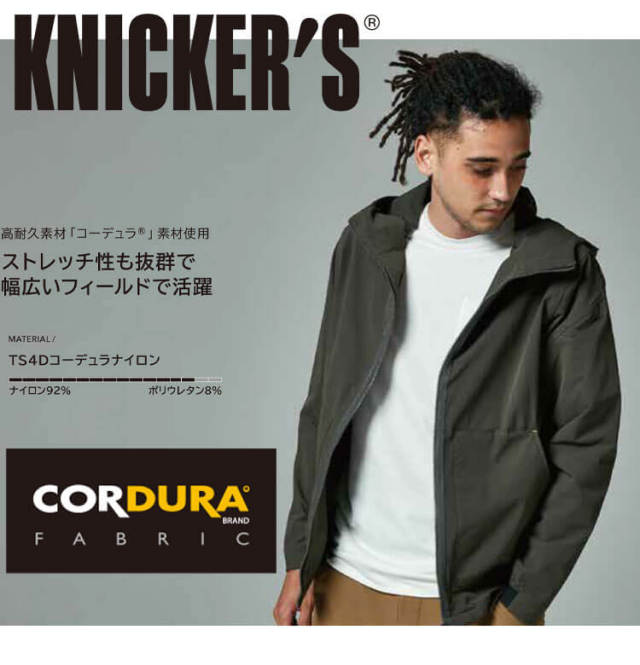 高耐久素材「コーデュラ」を使用、ストレッチ性も抜群なフード付きジャケット。独自開発のこの素材は、優れた強度と耐久性、全方位に伸びる抜群のストレッチ性を持つコーデュラナイロンストレッチクロスを二重織にする事により肌面の接触面が少なくなり、肌離れが良い。耐久性も通常のTC素材、ポリエステル素材と比べて2~3倍の摩耗強度を誇ります。