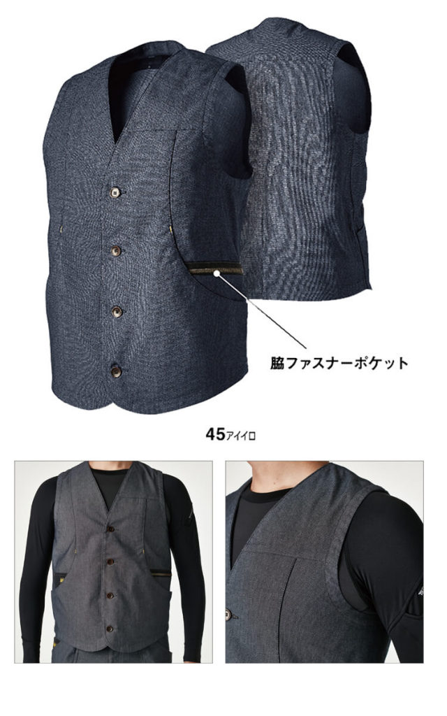 和のテイストとTSの新たなテクノロジーの融合されたワークベスト。日本特有の和のテイストで人とは違った風合いの作業服です。安心の日本製素材を使用し、軽量・ストレッチ・形態安定性など機能性に優れた作業着になっています。