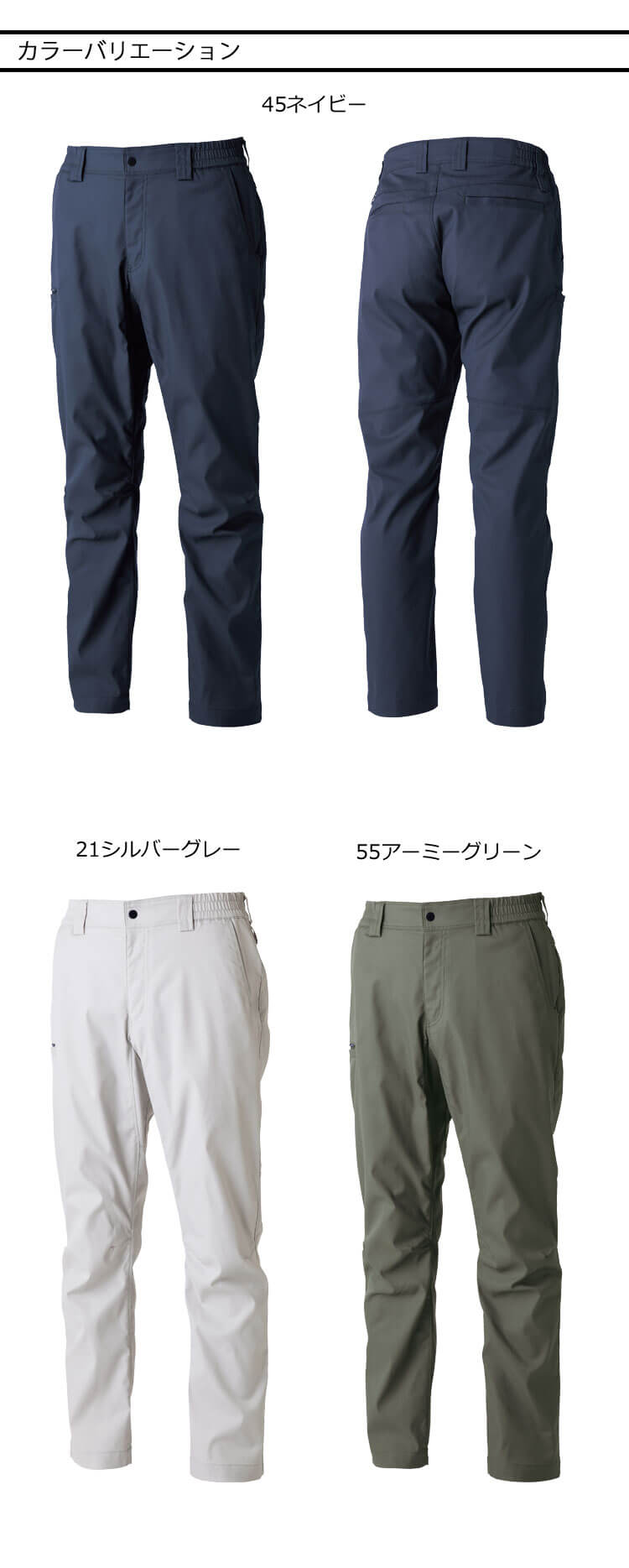 21シルバーグレー・45ネイビー・55アーミーグリーン・65トープ・95ブラック