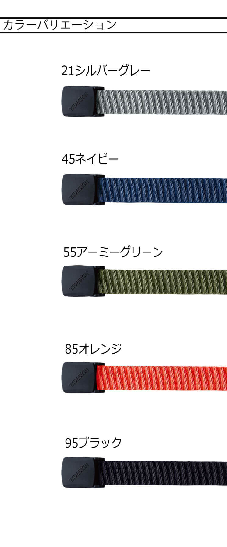 21シルバーグレー・45ネイビー・55アーミーグリーン・85オレンジ・95ブラック