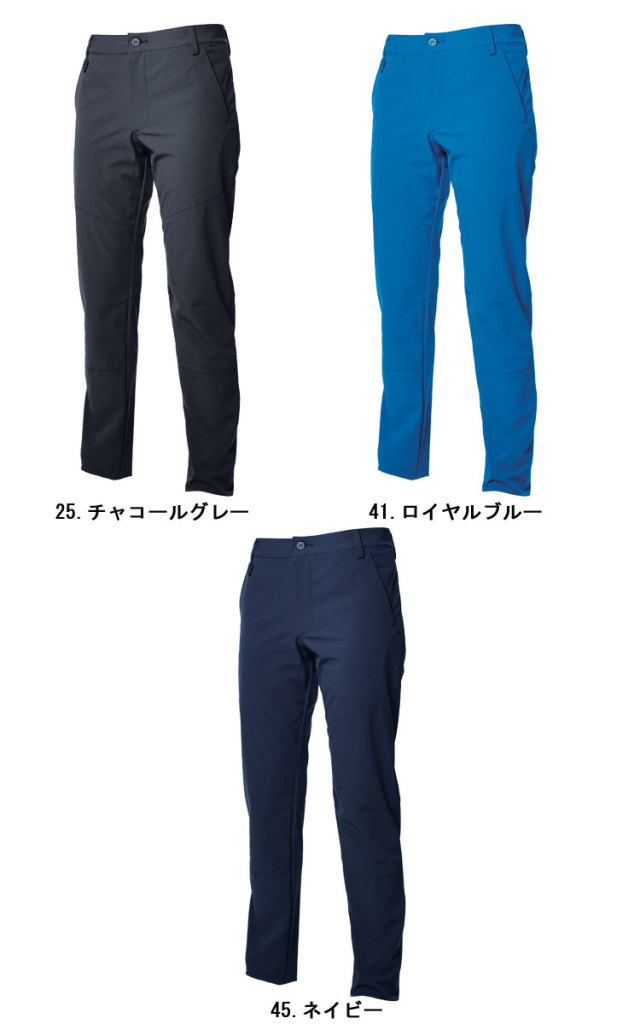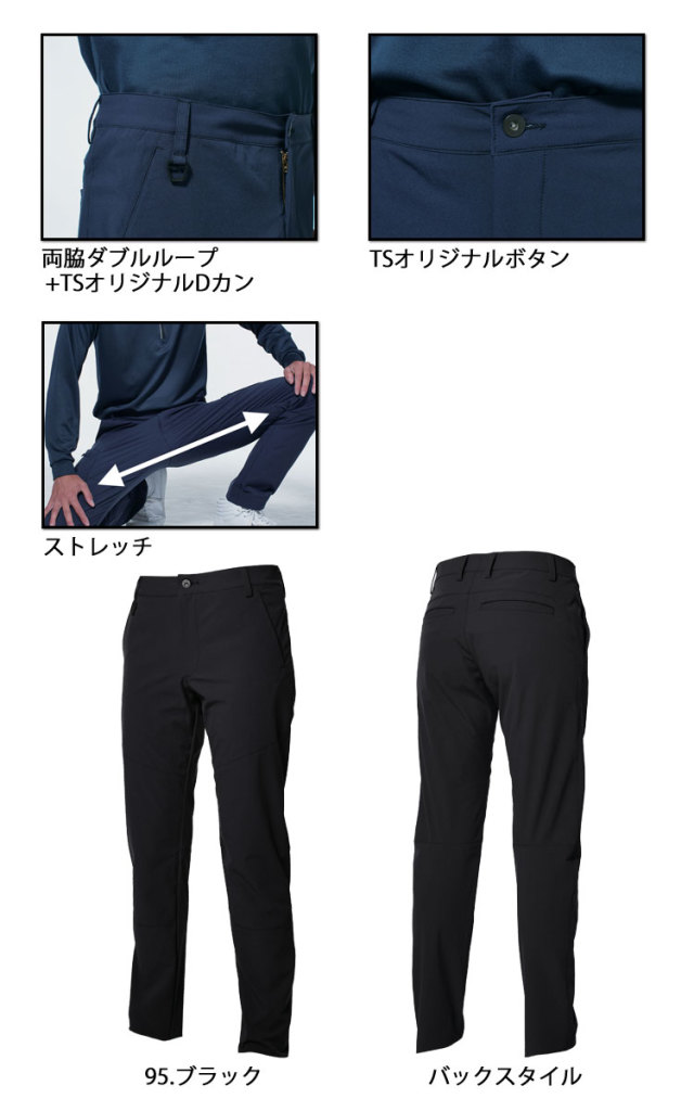 タテ・ヨコ全方位に伸びる「TS 4Dストレッチ」を使用。物を傷つけにくい極力突起物を減らした仕様。マーバスL加工による吸汗速乾、帯電防止、汚れが付いても落ちやすい。カラーバリエーションもチャコールグレー、ブラック、ロイヤルブルー、ネイビーを展開。