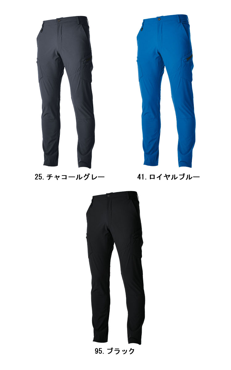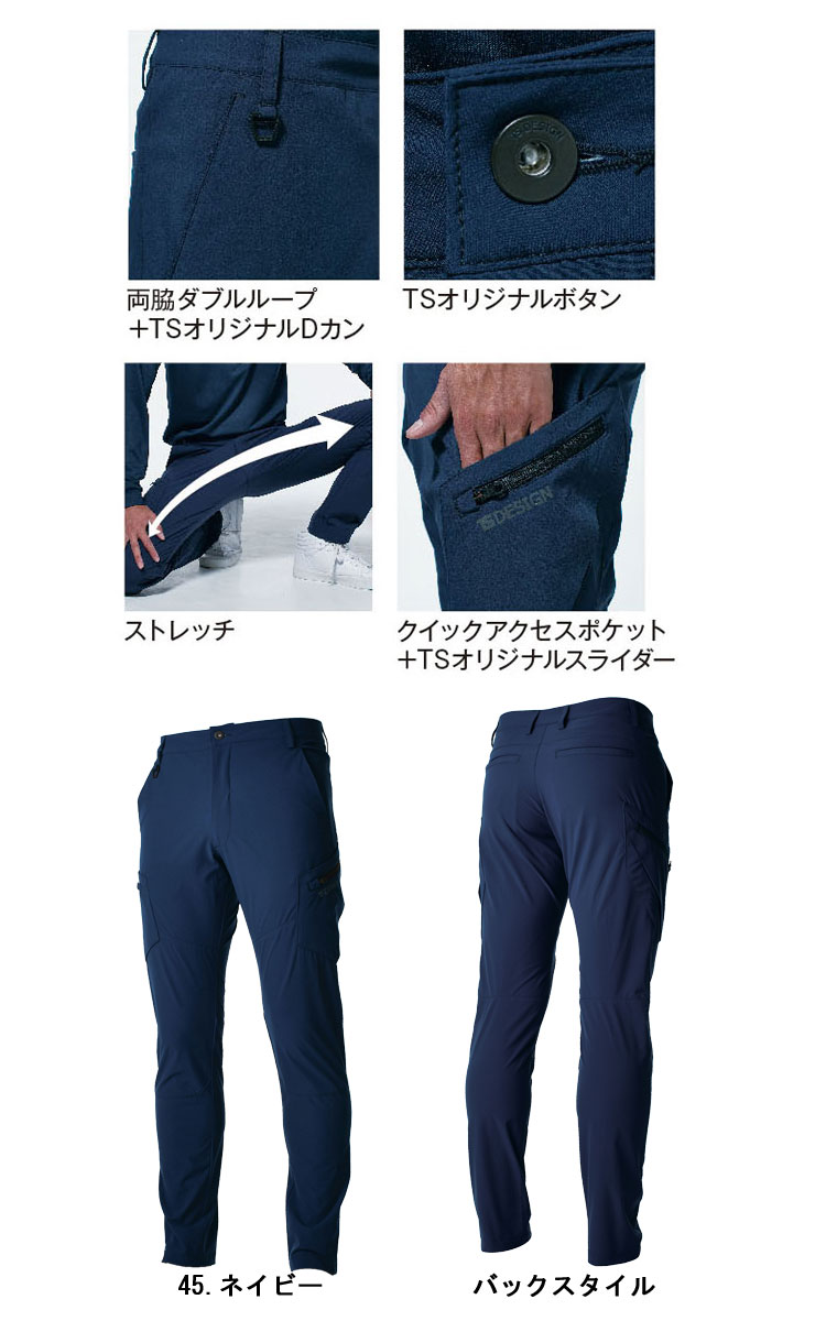 タテ・ヨコ全方位に伸びる「TS 4Dストレッチ」を使用。物を傷つけにくい極力突起物を減らした仕様。マーバスL加工による吸汗速乾、帯電防止、汚れが付いても落ちやすい。カラーバリエーションもチャコールグレー、ブラック、ロイヤルブルー、ネイビーを展開。