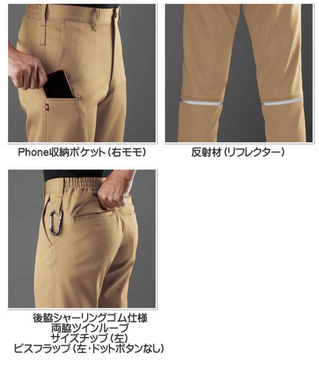 【素材】:ストレッチ高密度ツイル(伸長率17%)、制電ケア設計