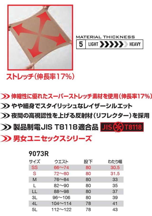 快適ストレッチ素材ポリエステルツイル伸長率17%の作業服です。夜間作業にも対応可能な高視認リフレクターを装着。伸縮性に優れた優れたスーパーストレッチを採用し、製品制電JIS T8118にも適合するシリーズです。夜間の視認性を上げる反射材を使用することで夜間作業も対応可能です。トレンドをおさえたやや細身のスタイリッシュなレイザーシルエットを採用した、男女兼用のシリーズです。