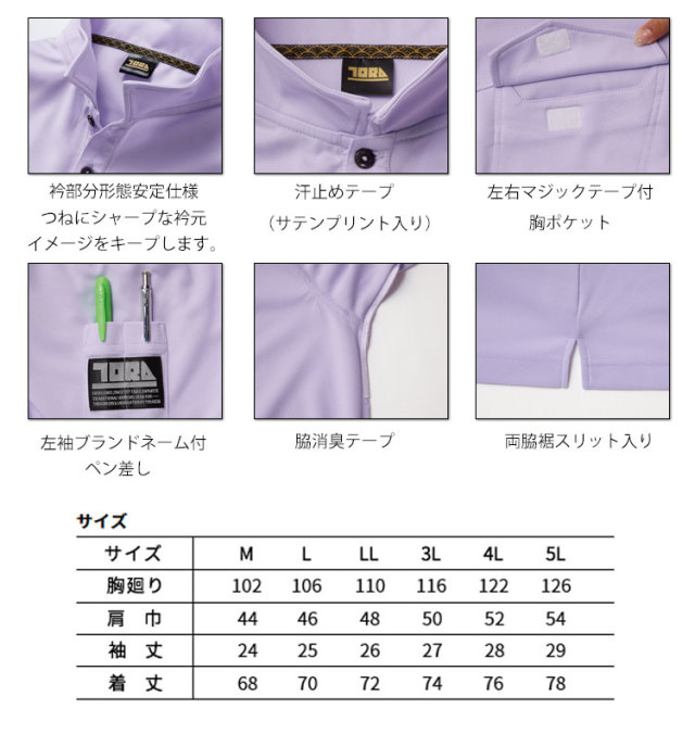 定番商品のミニ衿ポロシャツに半袖が登場!小さ目で形状安定テープの入っている衿は立てても寝かせてもビシッとキマります。マジックテープ式の両胸ポケットは内部をカットしてあるので出し入れもスムーズ。衿後ろ汗止めテープ、脇消臭テープ等、こだわり満載のスタイリッシュな印象の半袖ポロシャツ。