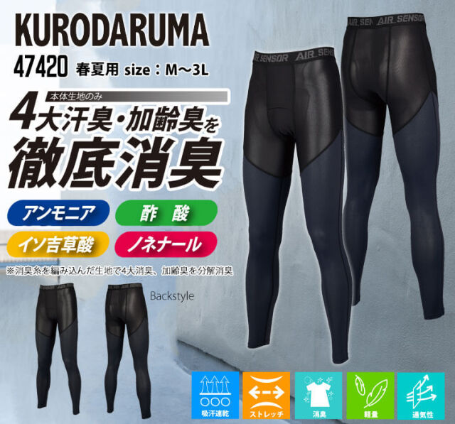 クロダルマのアンダーパンツです。エアセンサー史上極薄インナーです。本体生地の糸を消臭糸で編み込んでいるため、アンモニア、酢酸、イソ吉草酸、ノネナールの4大汗臭、加齢臭を分解消臭の汗をかく暑い時期に最適な夏用タイツです。優れたストレッチ性と通気性、軽量・接触冷感で快適な着用感です。
