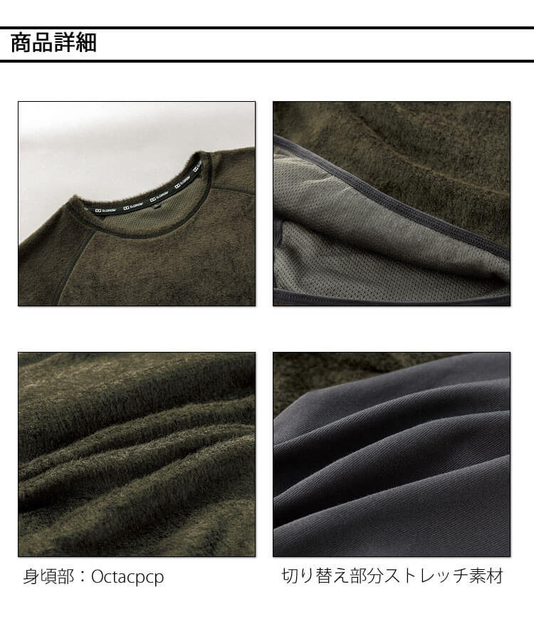 ディーグローの秋冬長袖インナーです。優れた保温性を発揮する快適機能素材「Octacpcp」を採用しています。「Octacpcp」とは、トリコット生地の為、中綿の吹き出しや片寄りがなく、自由な製品設計が可能な中綿と空気をたくさん含むことで、軽量且つ高い保温性を実現する裏地を一体化した快適機能素材のことです。切替部分にはストレッチ性の高いニット素材を採用し、動きやすさをアップしたインナーでもアンダーウェアとしても着用できる商品です。
