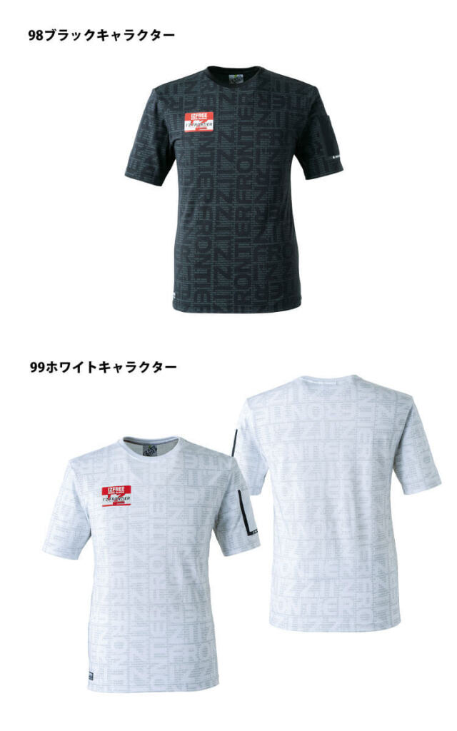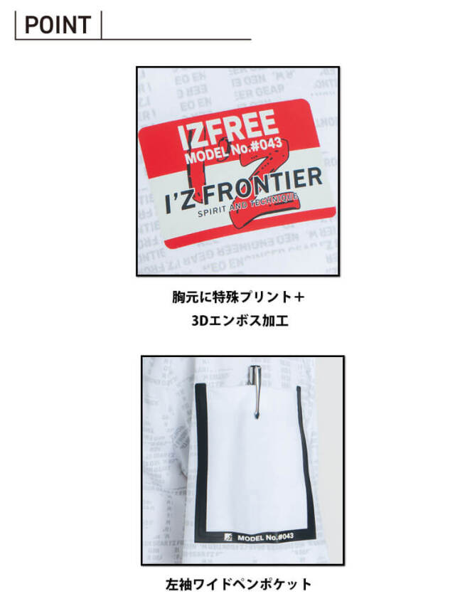 大人気I'Z FRONTIERの041シリーズ 春夏作業服です。素材表面はカジュアルテイスト高い綿糸を、同裏面には高い機能性のポリエステル糸を使用したダブルフェイスニット素材です。 素材表面には毛羽を取り除いたシェーブ製法糸を使用しました。夏場に爽やかな着心地を発揮します。 素材裏面には吸水速乾性と接触冷感性を併せ持つ異形断面糸HIGH COOLを使用しました。冷感ナノ状粉体を繊維内側に練り込みサラリとした快適な着心地を実現します。 爽やかな素材感のみならず、溶剤浸透による冷感加工を施し一般基準を凌ぐ接触冷感指数を実現しました。着用時の更なる快適性アップを実現しました。特殊プリント+3Dエンボス(#042&#043)等、様々な製法のブランドロゴプリントを採用し、ハイブランド的ラグジュアリーテイストを演出する高いデザイン性を発揮します。オン・オフを問わずあらゆるシーンをリッチに演出します。