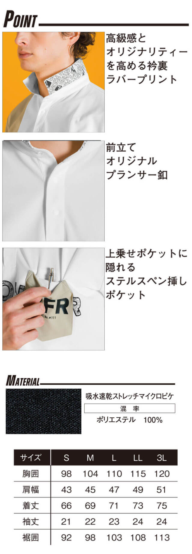 細番手の糸を惜しげもなくふんだんに使用し高級でシャープなルックスを実現。ワークシーンのみならず様々なシーンをアクティブに演出します。衿裏側にアイズフロンティアならではのラバープリントを施し高級感とオリジナリティーを高め、前立てオリジナルプランサー釦がスポーツライクを演出します。