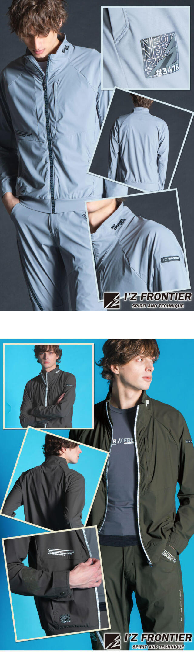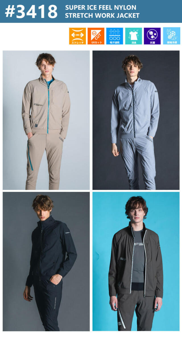 大人気I'Z FRONTIERの3418シリーズ 春夏作業服です業界最強レベルの接触冷感指数を誇るハイパフォーマンスモデルです。 冷感性の高いナイロン糸に溶剤浸透による冷感加工を施し一般基準値約1.9倍の接触冷感指数を実現しました。99%のUVカット性能も併せ持ち、汗ばむ季節にその真価を遺憾なく発揮します。 接触冷感性のみならず、さらりとしたパウダータッチの肌触りも魅力です。 経編のニット素材を採用しまいた。織物素材では実現困難なニット素材特有の着心地の良さと、高い抗スナッグ性(4級)、抗ピリング性(5級)や破裂強さ(404kPa)等、経編構造特有の生地の強度を併せ持ち、優れたハリコシ感の素材感が着用時のシワを軽減します。 伸長率タテ約15%・ヨコ約44%、伸長回復率(1時間後)タテ約100%・ヨコ約96%のハイレベルな全方向ストレッチ性能を有し、ストレスのない快適な動き易さと、安定感のあるスタイリッシュなシルエットキープを実現します。着心地の良さのみならず、溶剤浸透による加工を施しハイレベルな吸水速乾性、抗菌防臭性も併せ持つ快適感の高い完成度を誇ります。アスリートマインドを体現するアイズスポーツならではの先進性高いシャープでスタイリッシュなデザイン性です、様々な質感の同色系ロゴプリント等を施しさりげない高級感を演出します。 先進性を表現するブランドロゴ入り止水ファスナーや、国産YKK社製を使用したドット釦等、細部にまで拘りを追求しています。