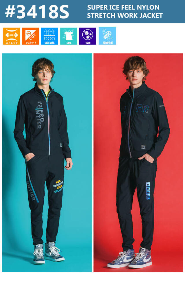 大人気I'Z FRONTIERの3418シリーズ 春夏作業服です。業界最強レベルの接触冷感指数を誇るハイパフォーマンスモデルです。 冷感性の高いナイロン糸に溶剤浸透による冷感加工を施し一般基準値約1.9倍の接触冷感指数を実現しました。99%のUVカット性能も併せ持ち、汗ばむ季節にその真価を遺憾なく発揮します。 接触冷感性のみならず、さらりとしたパウダータッチの肌触りも魅力です。 経編のニット素材を採用しまいた。織物素材では実現困難なニット素材特有の着心地の良さと、高い抗スナッグ性(4級)、抗ピリング性(5級)や破裂強さ(404kPa)等、経編構造特有の生地の強度を併せ持ち、優れたハリコシ感の素材感が着用時のシワを軽減します。 伸長率タテ約15%・ヨコ約44%、伸長回復率(1時間後)タテ約100%・ヨコ約96%のハイレベルな全方向ストレッチ性能を有し、ストレスのない快適な動き易さと、安定感のあるスタイリッシュなシルエットキープを実現します。着心地の良さのみならず、溶剤浸透による加工を施しハイレベルな吸水速乾性、抗菌防臭性も併せ持つ快適感の高い完成度を誇ります。アスリートマインドを体現するアイズスポーツならではの先進性高いシャープでスタイリッシュなデザイン性です、様々な質感の同色系ロゴプリント等を施しさりげない高級感を演出します。 先進性を表現するブランドロゴ入り止水ファスナーや、国産YKK社製を使用したドット釦等、細部にまで拘りを追求しています。
