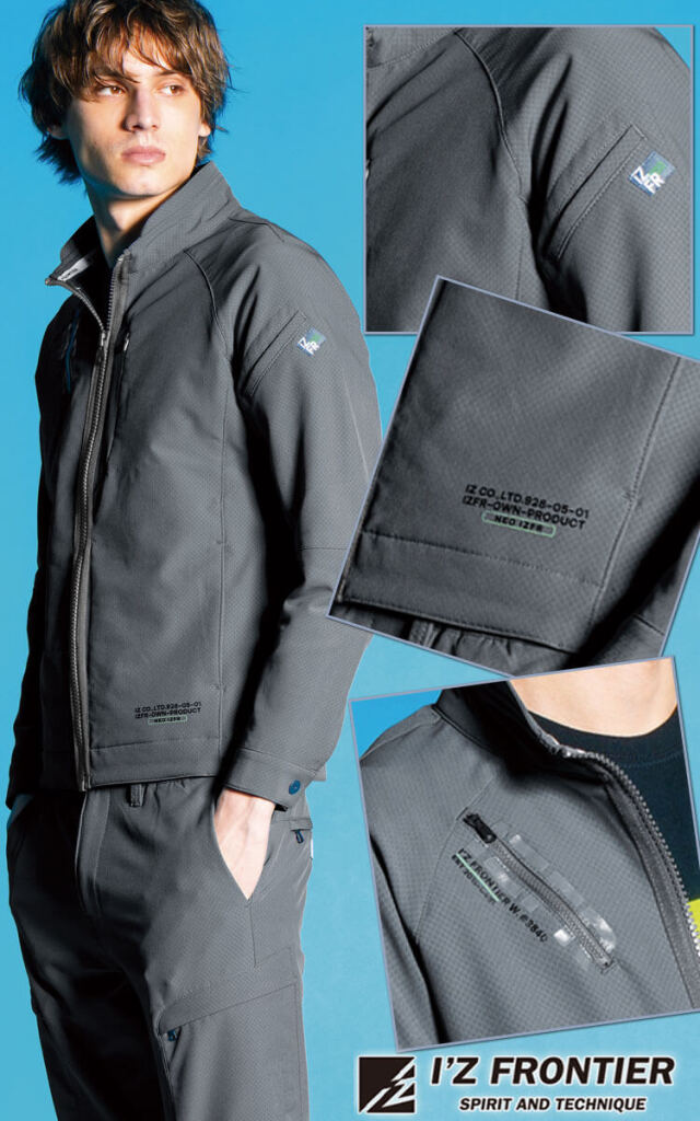 大人気I'Z FRONTIERのオールシーズン作業服です。独特な織り構造を採用したワイルド感溢れる二重織素材を採用。色の濃淡をさりげなく表現し、高級感と先進性を兼ね備えた独特のルックスを実現します。3種類の原糸を絶妙に配する事により年間を通じて快適な着用を実現する3D設計構造。表面には細番手の原糸を高密度に配し高級感溢れるマットなルックスに仕上げ、裏面には2種類の太さの原糸をバランス良く織り込む事により重さを軽減したボリューム感を実現。生地裏面の点接触凹凸構造がエアーポケット効果によるウォーム感生み出し、衣服内の快適を保ちます。シーンを選ばない先進的なシャープなデザインに、アイズフロンティアならではの厳選されたレタリングプリントをプラス。さり気ないリッチ感を演出します。ファスナーやドット釦等に国産YKK社製を使用。細部にまで拘りを追求しています。