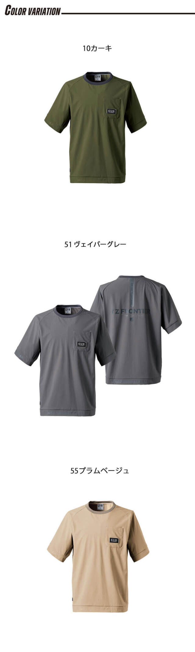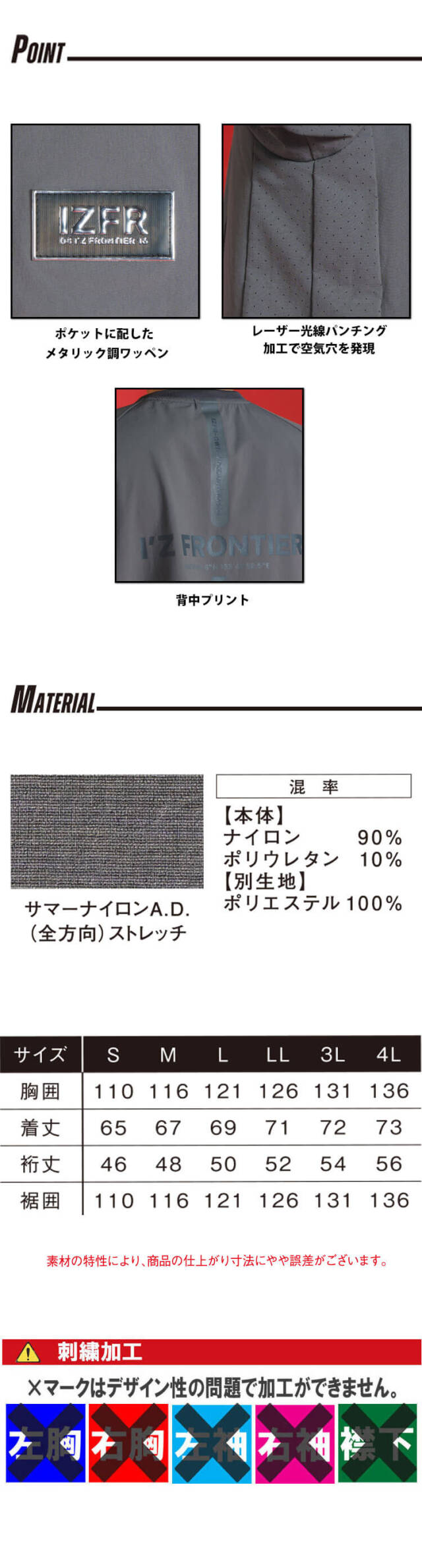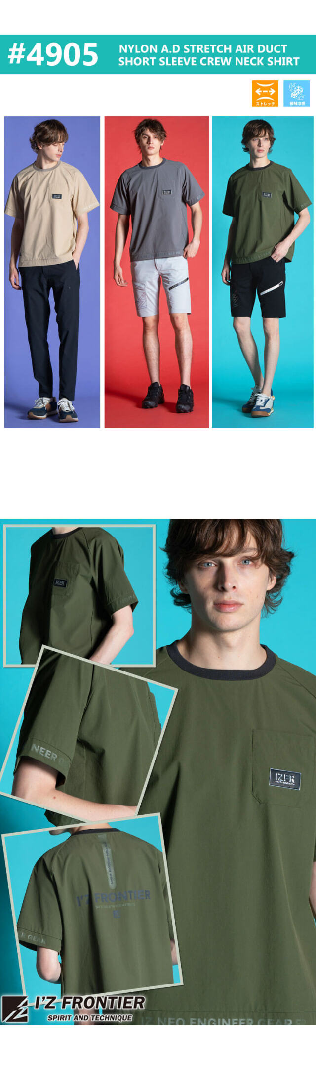 大人気I'Z FRONTIERの4903シリーズの春夏作業服です。しなやかな全方向ストレッチ素材をベースに、異素材を組み合わせて誕生した抜群の快適性能を誇るスポーティーテイストユーティリティーウェアです。 本体素材には伸長率タテ約41%・ヨコ約29%、伸長回復率(1時間後)約90%を誇るハイレベルな全方向ストレッチ性能を有するナイロン素材を使用しています。ストレスフリーな動き易さを実現します。 適度にハリ感を有しながらも優しい肌触りを両立します。適度な接触冷感性も併せ持ち、リッチな佇まいを発揮しながらも快適な着心地を実現します。 しなやかな風合いながらも一般基準の3倍以上を誇るハイレベルな引裂き強度(タテ約36N・ヨコ約49N)や優れた抗ピリング性能、抗スナッグ性能(全て5級)等を有し、抜群の生地強度を誇ります。 トップスの脇&パンツの内股にはレーザー光線パンチング加工で空気穴を発現させた素材を採用し衣服内の熱を効果的に排出します。加えてパンツ脇側には2種類の異なる組織のメッシュ素材を使用したダブルメッシュ構造で更なる衣服内の通気性アップを実現しました。汗ばむ季節にその真価を遺憾なく発揮します。 胸ポケットに配したメタリック調ワッペンや背面等各所に施されたプリント(#4905)、右脚のシームテープ付き止水ファスナーポケットや後身頃の大胆なビッグロゴプリント、脇メッシュパーツへのロゴプリント(#4903&#4904)等様々なギミックを搭載し、ソフィスティケートなスポーティールックスを表現しました。タック釦やDカン、前立てファスナーにはYKK社製を使用しています。細部にまで品質を追求しています。