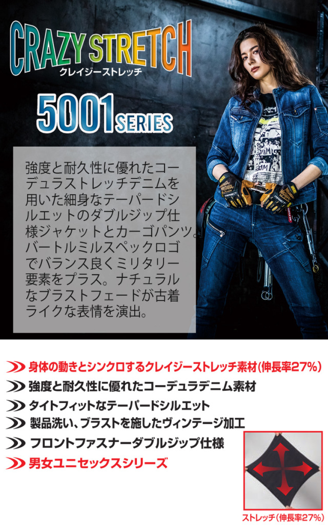 BURTLEバートルの5001シリーズです。強度と耐久性に優れたコーデュラストレッチデニムを用いた細身なテーパードシルエットのダブルジップ仕様ジャケットとカーゴパンツ。バートルミルスペックロゴでバランス良くミリタリー要素をプラス。ナチュラルなブラストフェードが古着ライクな表情を演出。
