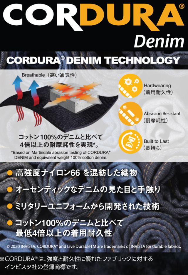 ・強度と耐久性に優れたコーデュラデニム素材