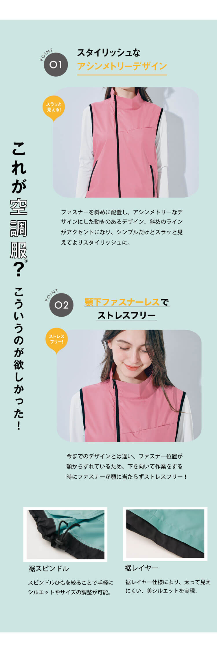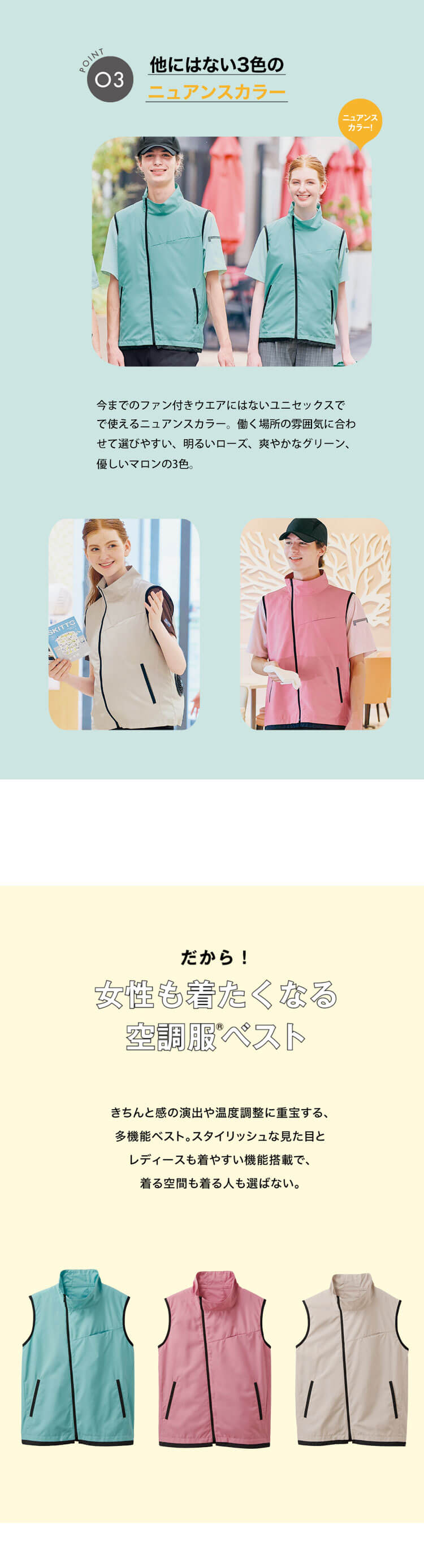 セロリー WSP SKITTOの空調服です。TioTioプレミアムの空調ベストです。着る空間も着る人も選ばない、男女兼用の空調ベストです。レディースメーカーが提案する女性が着たくなる空調服ベストです。センターフロントにまっすぐファスナーがあるとどこか野暮ったく見える、より着やすくファッショナブルに取り入れてもらえるようアシンメトリーなデザインとなっております。ファスナーが顎下に来ないから下を向いた時に当たりにくく邪魔にならないのみ嬉しいポイントです。風が首を通りやすいエアダクト仕様になっています。特に風がほしい首裏にしっかりと風を感じられるよう、背中のファンから取り込んだ風が上に流れやすい縦切り替え仕様です。他にはないニュアンスカラーで働く場所の雰囲気を選べてユニセックスで使える3色展開です。新鮮なカラーリングに黒配色を施すことで男女問わず着やすくSKITTO商品にも似合うデザインです。TioTioプレミアムは、空気中の酸素を利用して最近の増殖を抑えるので、お仕事中、気になる抗ウイルスや抗菌、消臭に高い効果があります。また、洗濯耐久性も高く効果が長続きし、防汚機能で汚れも落ちやすくなっています。ウイルスや細菌などのリスクを最小限に抑えてくれる優秀機能です。