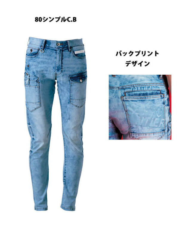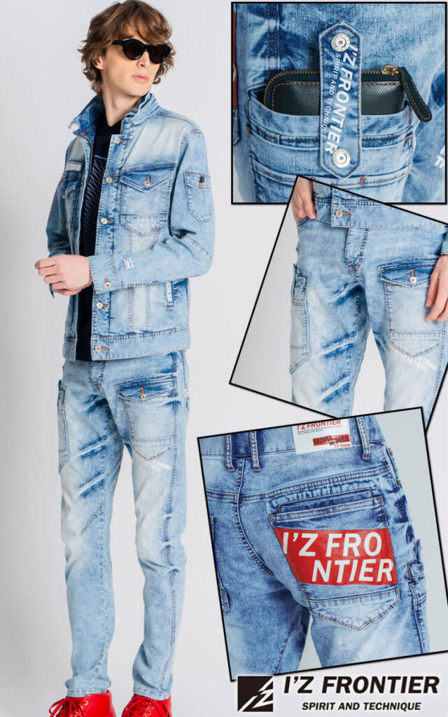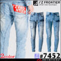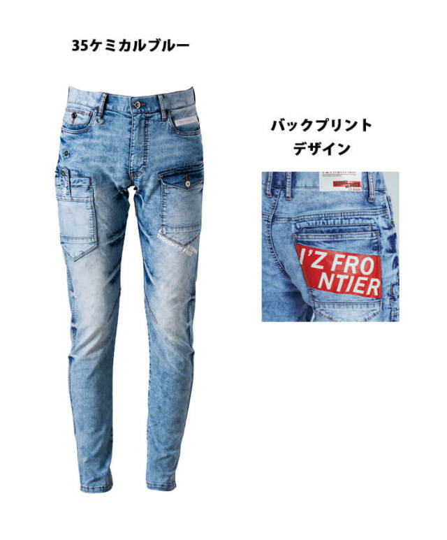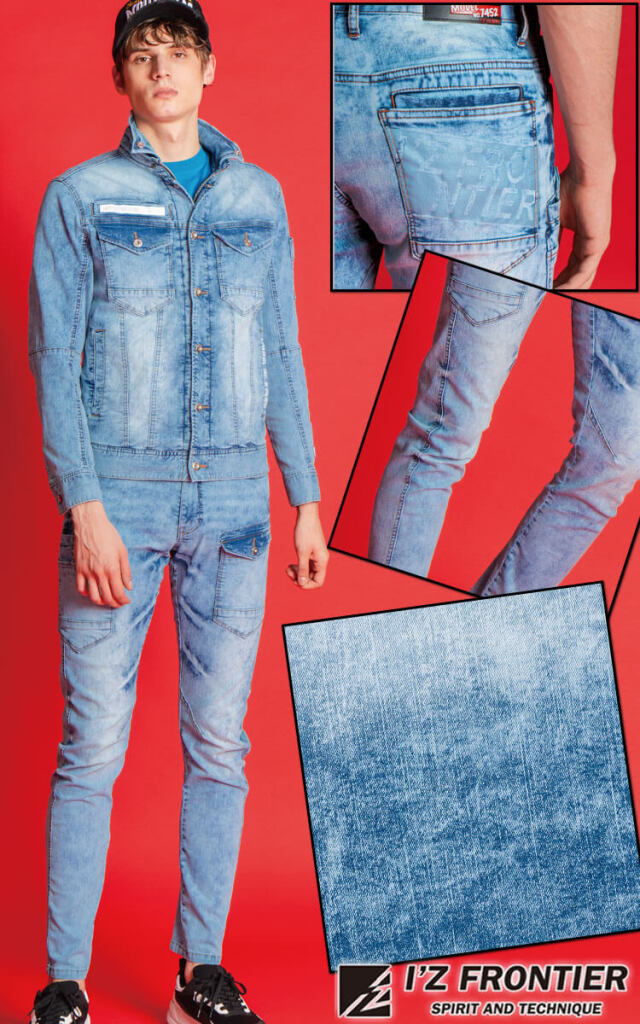 大人気I'Z FRONTIERの7450シリーズ 春夏作業服です。大好評を博した#7350シリーズデニムワークウェアのSSシーズンモデルが登場しました。 ナノレベルまで砕いた冷感鉱物を裏面繊維内部に練り込み、ハイレベルな接触冷感機能を発揮します。肌面繊維の特殊構造により人体の汗を素早く吸収・拡散します。従来のデニム素材に比べて快適性がアップしたハイレベルな吸水速乾機能付きです。紫外線遮蔽率97%/UPF49を誇るセラミック練り込み繊維を肌面に使用し、高い遮熱性能を発揮します。ライトウェイトの素材でありながら、基準値タテ約2.5倍、ヨコ約5倍のハイレベルな引裂き強度を併せ持ちます。適度な伸長率(ヨコ約39%)を有する快適なストレッチ性能です。汗ばむ季節でもストレスの少ない動きやすさを実現すると共に、高い伸長回復率(1時間後約90%)により安定したスタイリングをキープします。素材のみならず、絶妙な3Dカッティングにより更なる動きやすさとスタイリッシュなルックスを両立しました。アイズならではのオリジナリティー高いブランドロゴプリントを施した、ユーロテイスト漂う気品高いデザイン性です。あらゆるシーンで強い存在感を発揮します。(80番色のみシンプル仕様です。)ケミカルウォッシュ+ブラスト+ピン打ち加工でワイルドテイストに仕上げた35番色とライトなケミカルウォッシュ加工でシンプルなワークウェアテイストに仕上げた80番色、35番色と同等の加工にハンドメイドのペンキ散らしを加えポップ&ラグジュラリーテイストに仕上げた77番色の異なる個性の3タイプをラインナップしました。金属ファスナー、ドット釦等は国産YKK社製を使用。細部にまで品質に拘っています。