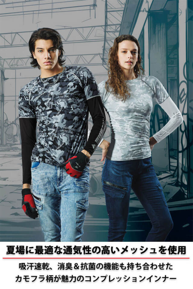 夏場に最適な通気性の高いメッシュを使用。吸汗速乾、消臭&抗菌の機能も持ち合わせたカモフラ柄が魅力のコンプレッションインナー。現場の声から生まれました!「着丈」と「桁丈」ロングタイプ!着丈が長いから、しゃがんでも安心。桁丈が長いから、ケガ・日焼け防止に。
