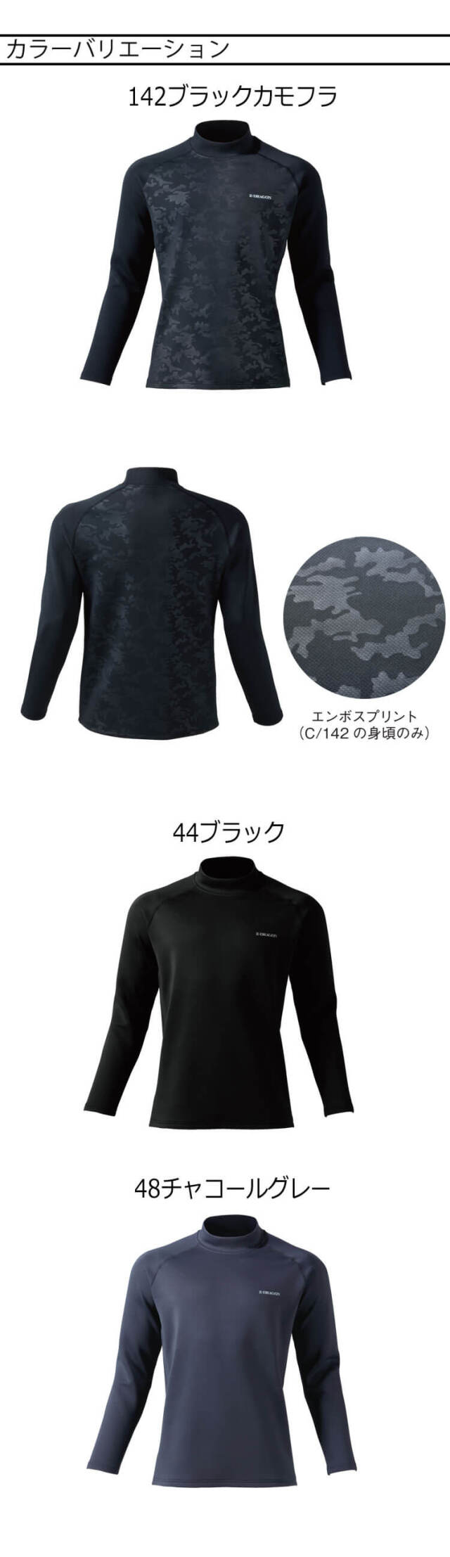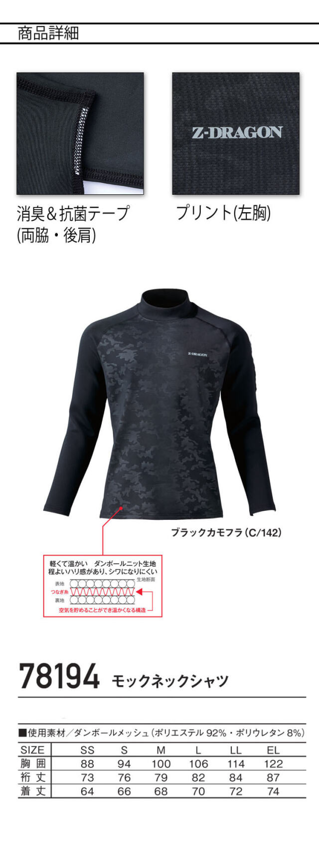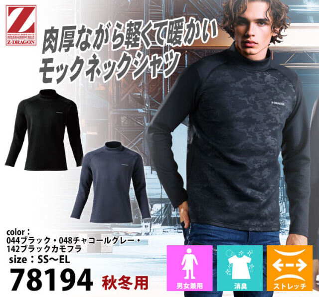 Z-DRAGONのモックネックシャツです。寒い冬に最適な吸湿発熱加工素材を使用した長袖シャツです。吸汗速乾機能も備え、消臭・抗菌機能も確保、縫製糸に制電糸を使用し静電気対策も万全です。軽くて温かく、程よいハリ感があり、シワになりにくいダンボールニット生地を使用しています。