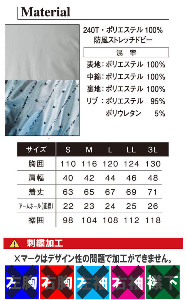 ・素材:240T 防風ストレッチドビー