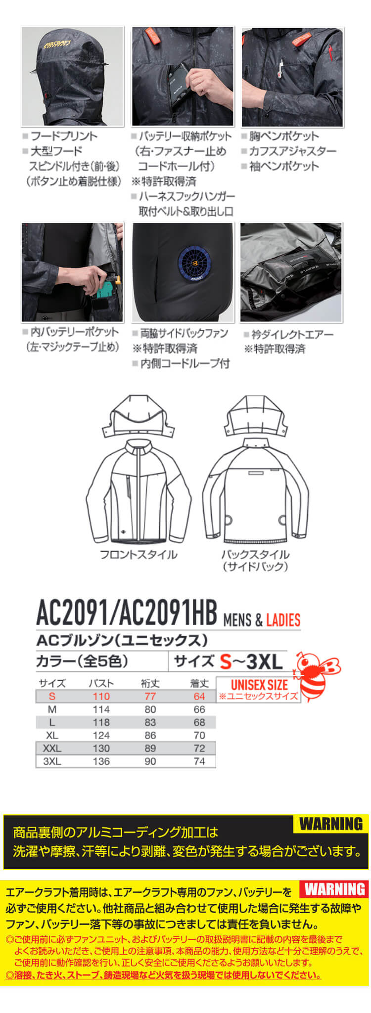 ☆ファン付き専用作業着 AC2091(長袖ブルゾン)大人気デザイン!! 【AC2091 ファン付き専用作業着 AIRCRAFT エアークラフト 長袖作業着 】 です。