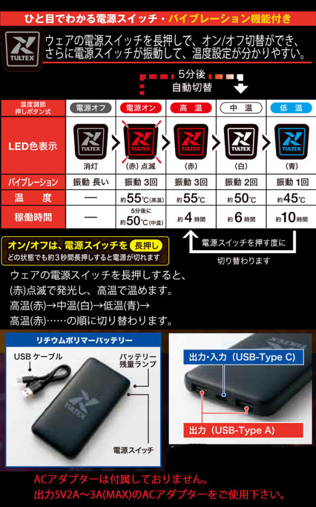 ※ベストの電源スイッチを長押しでON/OFF切替ができます。