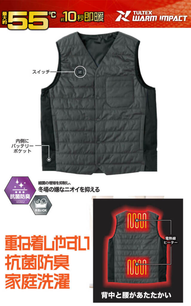 10秒即暖電熱Vネックヒーターベストのフルセットです。男女兼用です。首元から背中と腰にかけての2箇所に電熱線ヒーターを採用しています。胸のスイッチで3段階の温度調整機能付きです。バッテリーが付属しているため、すぐに使えるのが魅力です。手洗いもできるのでいつも清潔にご使用いただけます。細菌の増殖を抑制し、冬場の嫌なニオイを抑えてくれる抗菌防臭加工を施しています。防風ニット素材で風を防ぐテクノロジー防寒アウターウェアタイプです。畑仕事などガーデニング、農業 や運送業やサービス業,や土木業や建設業や建築業やアウトドアやウインタースポーツや散歩などあらゆる現場で対応します。