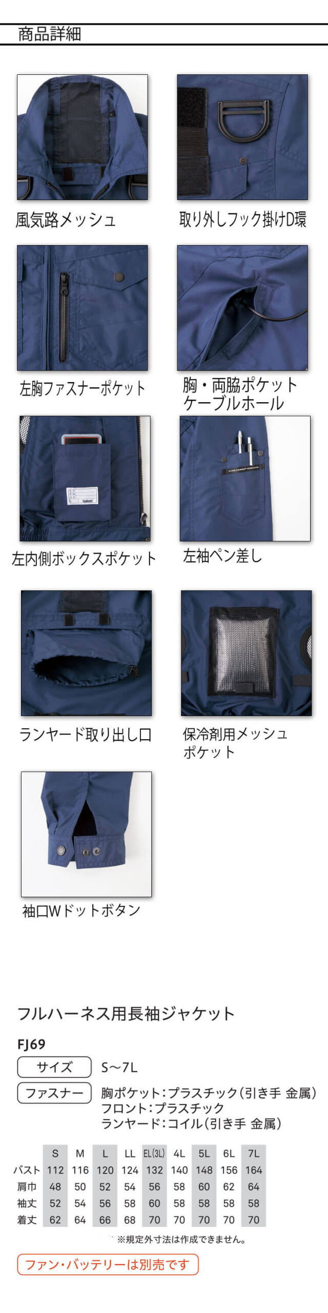 空調風神服ビッグボーン商事のBK6237FPのフルハーネス用長袖ジャケットです。間口を広くし、筒を短くすることでランヤードの取り出しがスムーズです。ビッグボーン商事の商品全バリエーション取り揃え、最短翌日発送のミチオショップ。暑さ・熱中症対策と節電の両立を目指して、ファン付き作業着、バッテリー、ファン、インナー、付属品まで全て取り揃えております。