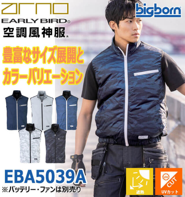 空調風神服アーリーバードのEBA5039Aシリーズのベストです。EBAシリーズEFウェアのベストセラーモデルです。裏チタンコーティングにより紫外線や赤外線をカットし衣服内の温度上昇を抑制します。背中は風気路メッシュ仕様で背中から首への空気循環効果をアップします。バイカラーのワーキングスタイルに豊富なカラー展開とサイズ展開が魅力です。ビッグボーン商事の商品全バリエーション取り揃え、最短翌日発送のミチオショップ。暑さ・熱中症対策と節電の両立を目指して、ファン付き作業着、バッテリー、ファン、インナー、付属品まで全て取り揃えております。