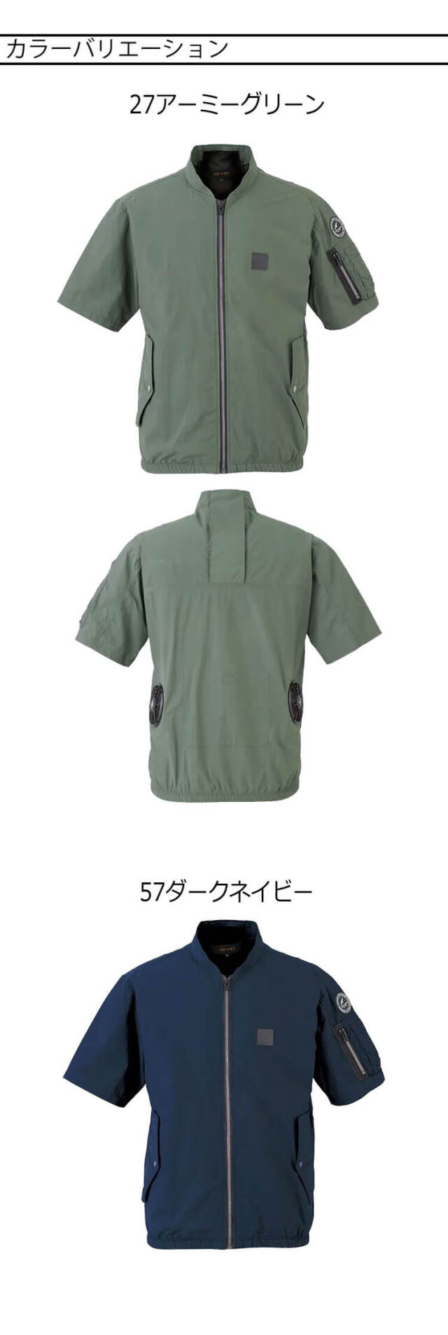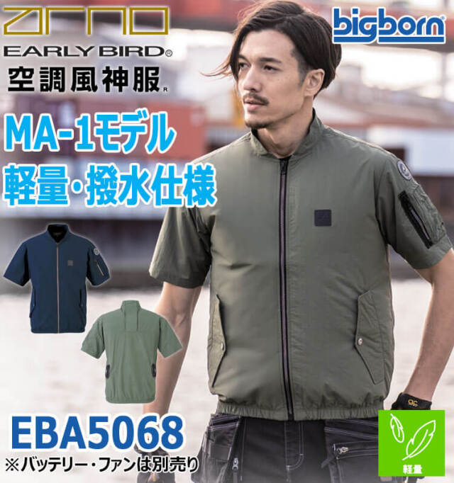 空調風神服アーリーバードのEBA5067シリーズの半袖ボンバージャケットです。クラシカルなボンバージャケットモデルです。背中は風気路メッシュ仕様で背中から首への空気循環効果をアップします。ビッグボーン商事の商品全バリエーション取り揃え、最短翌日発送のミチオショップ。暑さ・熱中症対策と節電の両立を目指して、ファン付き作業着、バッテリー、ファン、インナー、付属品まで全て取り揃えております。