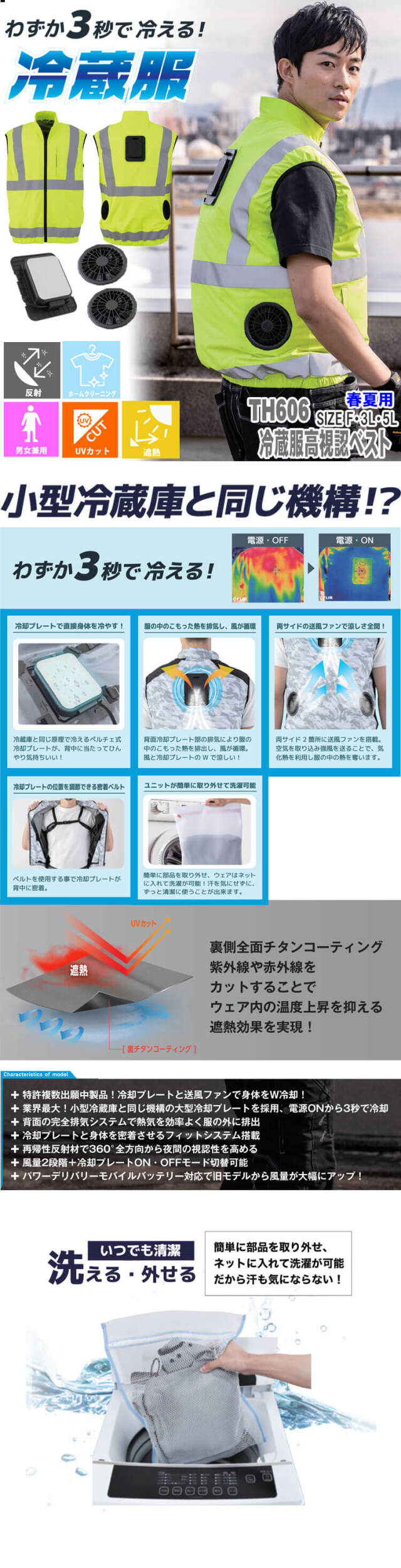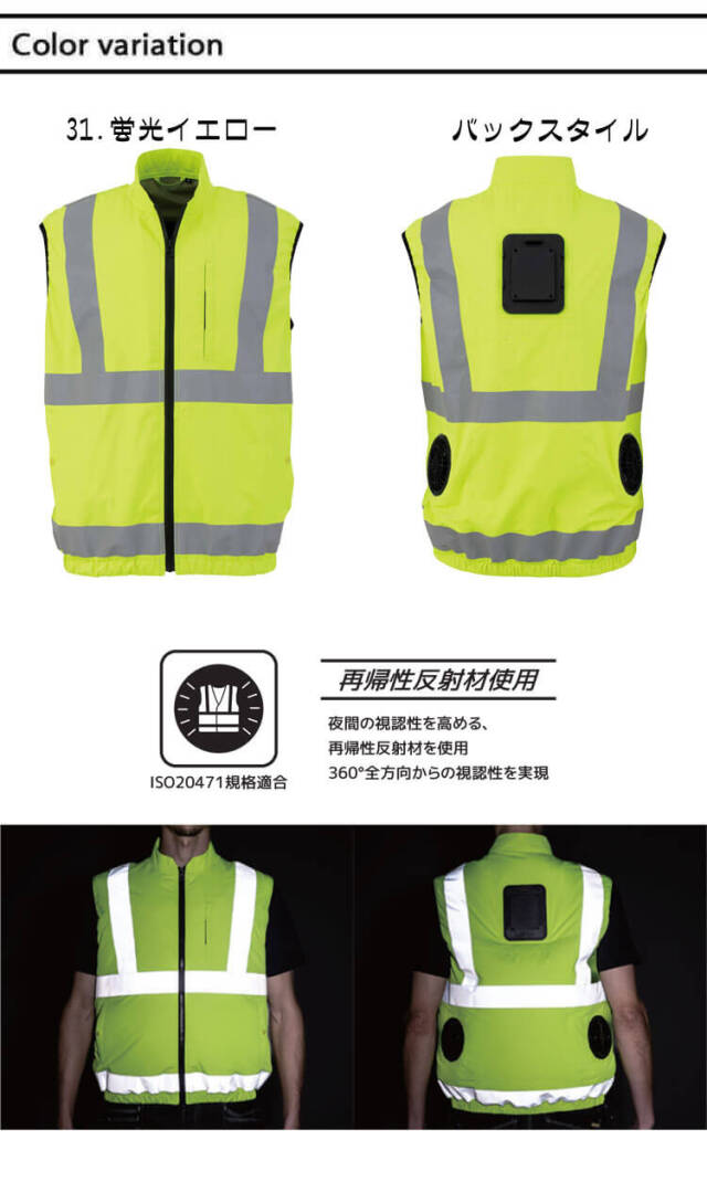 【ビッグボーン bigborn TH606 冷蔵服4 冷却プレートとファン付の高視認べスト】のページです。夜間の視認性を高める再帰性反射材を使用しています。冷却プレートとファンで火照った身体をクールダウン。背中の中央部に小型冷蔵庫と同じ冷却プレートを採用しました。電源をつけてから3秒で冷却します。冷却プレートをしっかりと未着させるためのディテールと構造です。両サイド2箇所に送風ファンを搭載しました。空気を取り込み強風を送ることで、気化熱を利用し服の中の熱を奪います。背面冷却プレート部の排気により服の中のこもった熱を排出し、風を循環させます。風と冷却プレートのWの涼しさを体感いただけます。軽量で持ち運びがしやすいためレジャー、アウトドアなどシーンを選ばずご着用いただけます。ビッグボーン bigbornの商品全バリエーション取り揃え、最短翌日発送のミチオショップ。暑さ・熱中症対策と節電の両立を目指して、ペルチェベスト、ファン付き作業着、バッテリー、ファン、インナー、付属品まで全て取り揃えております。