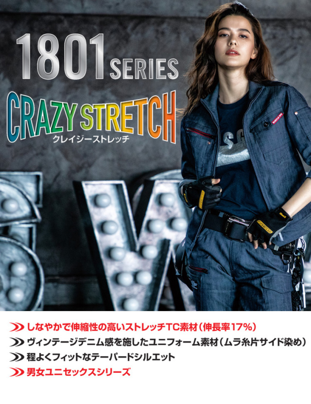 BURTLEバートルの1801シリーズです。しなやかで伸縮性の高いストレッチTC素材を採用(伸長率17%)。ヴィンテージデニム感を施したユニフォーム素材(ムラ糸片サイド染め)。程よくフィットなテーパードシルエットです。男女共にスタイリッシュに着こなせるバートルの自信作です。