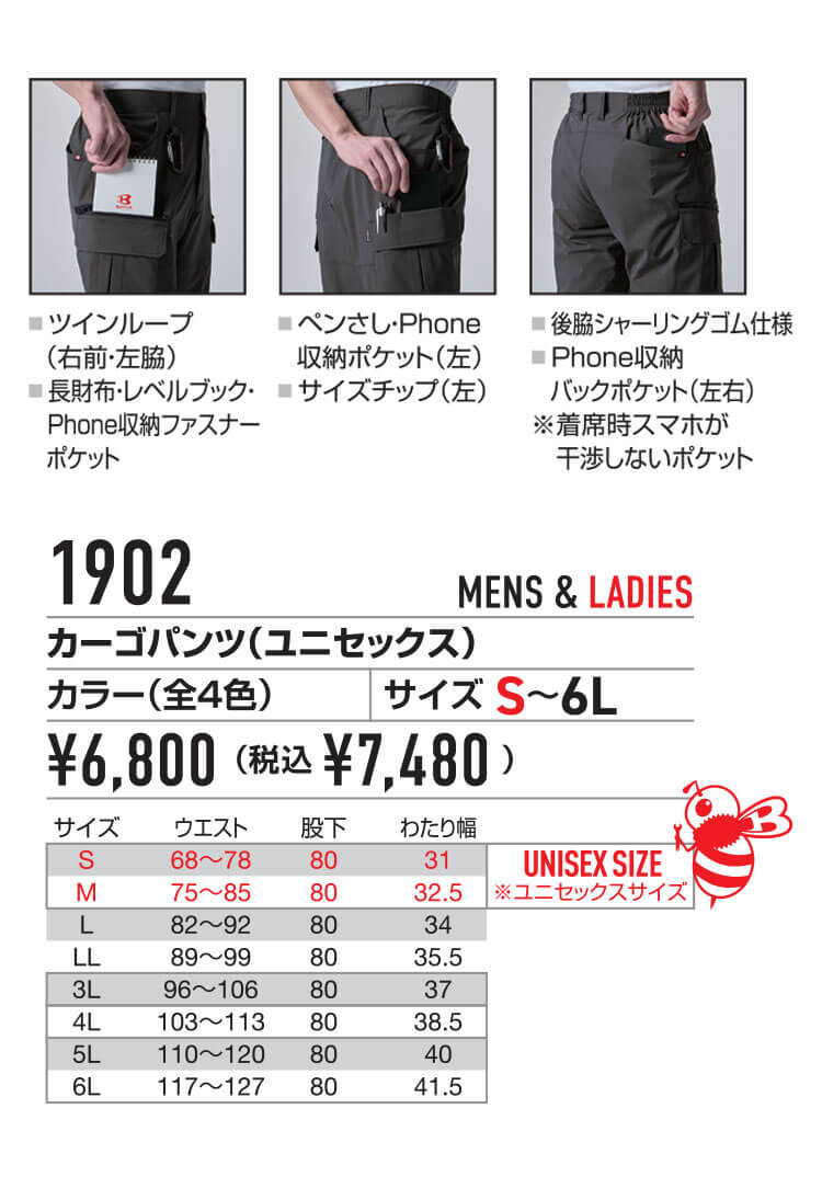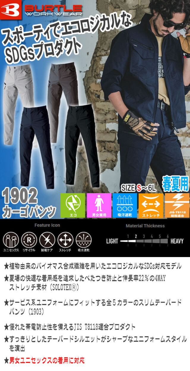 | 製品名: | BURTLE バートル エコ制電カーゴパンツ(ユニセックス) 1902 春夏 |