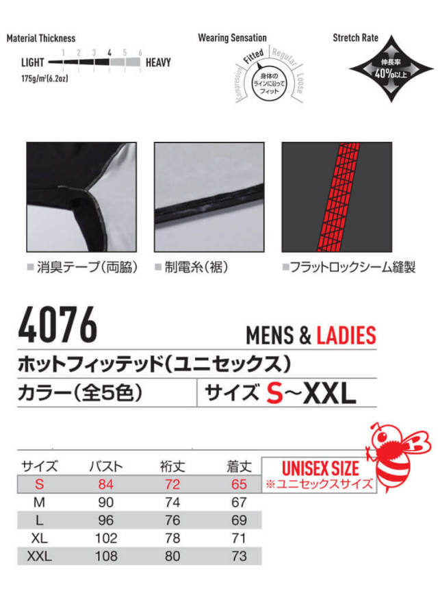 ・素材 :ホットストレッチ(伸長率40%以上)吸汗速乾、制電ケア設計、裏面起毛