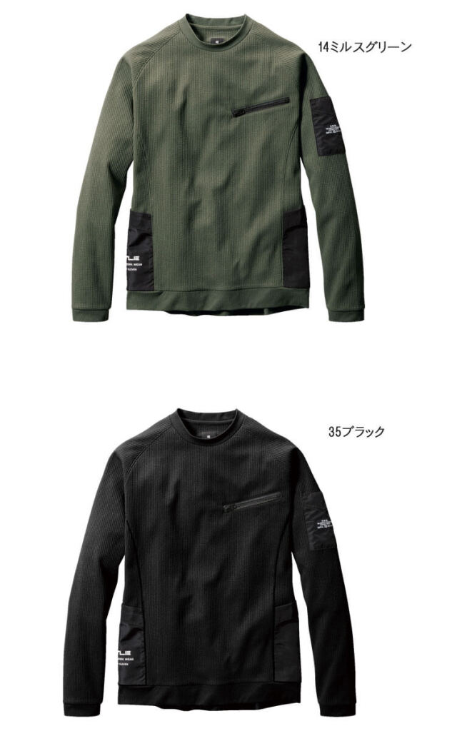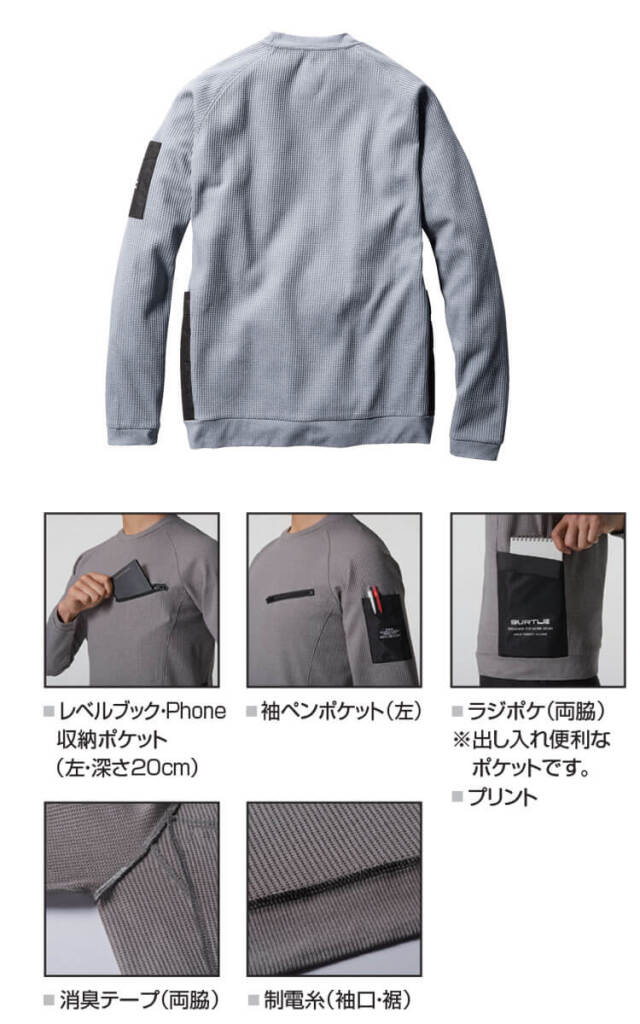 ・素材 : ストレッチワッフル(伸長率40%以上)、吸汗速乾加工、制電ケア設計