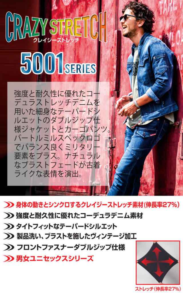 BURTLEバートルの5001シリーズです。強度と耐久性に優れたコーデュラストレッチデニムを用いた細身なテーパードシルエットのダブルジップ仕様ジャケットとカーゴパンツ。バートルミルスペックロゴでバランス良くミリタリー要素をプラス。ナチュラルなブラストフェードが古着ライクな表情を演出。
