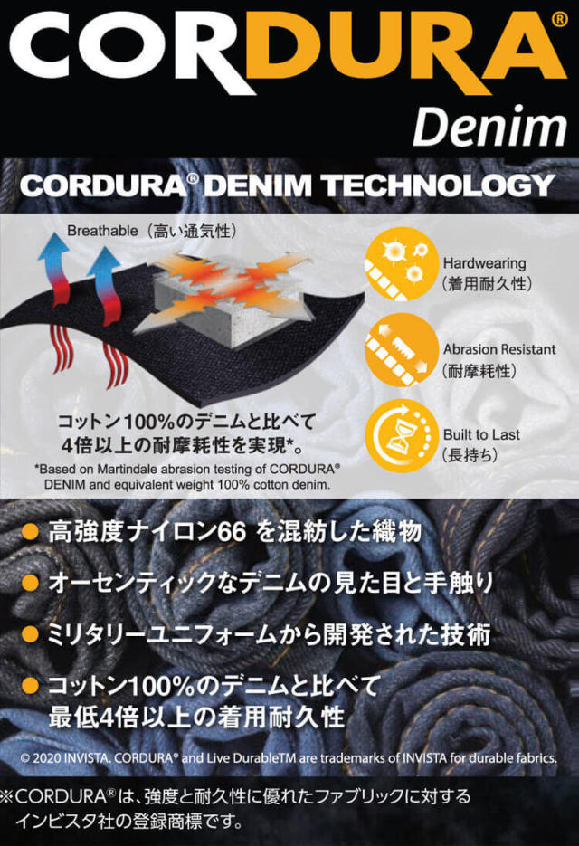 ★摩耗強度と耐久性に優れたコーデュラデニム素材を採用