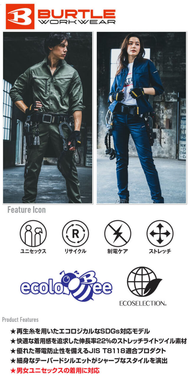 BURTLEバートルの6211シリーズです。グローバルスタンダードであるSDGsに対応し製品制電とストレッチ機能も兼備したシリーズです。現代のユニフォームスタイルにフィットするエコロジカルなプロダクトです。アイテムは、シャツ・カーゴパンツ・パンツの3種類です。カラー展開は、ミルシート・アッシュグレー・ネイビー・ブラックです。再生糸を用いたエコロジカルなSDGs対応モデルです。快適な着用感を追求した伸長率22%のストレッチライトツイル素材です。優れた帯電防止性を備えるJIS T8118適合プロダクトです。細身なテーパードシルエットがシャープなスタイルを演出します。男女ユニセックスの着用に対応しています。