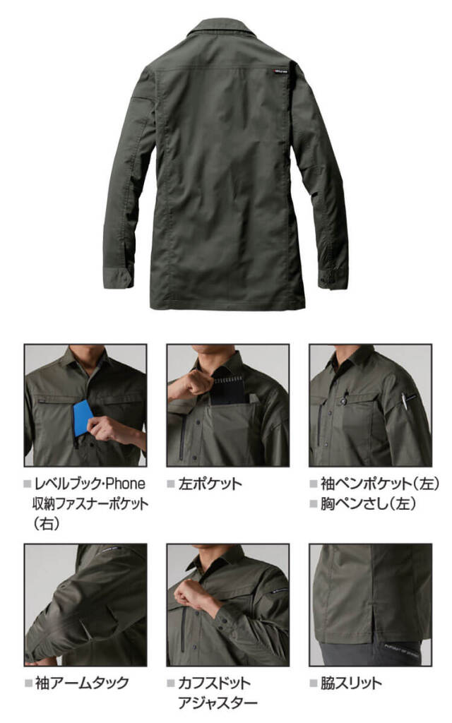 ・素材:エコストレッチライトツイル(伸長率22%)、制電ケア設計