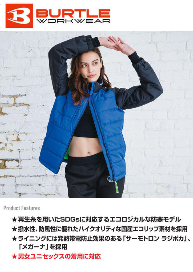 グローバルスタンダードであるSDGsに対応したスポーティなデザインの軽防寒が多様なユニフォームスタイルを洗練されたムードにセンスアップしました。再生糸を用いたSDGsに対応するエコロジカルな防寒モデルです。撥水性、防風性に優れたハイクオリティな国産エコリップ素材を採用しています。ライニングには発熱帯電防止効果のある「サーモトロン ラジポカ」、「メガーナ」を採用しました。男女ユニセックスの着用に対応しています。
