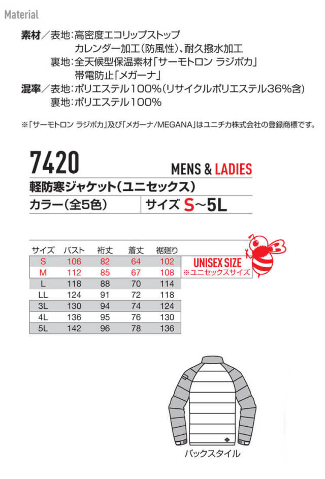 | 製品名: | 軽防寒ジャケット(ユニセックス) |