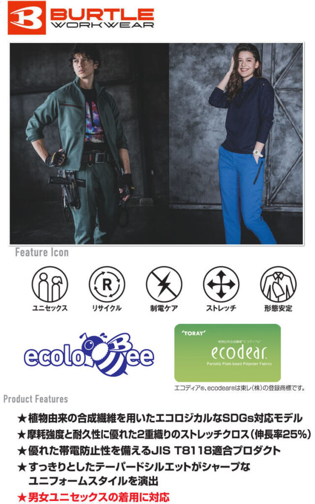 BURTLEバートルの9711シリーズです。スポーティなルックスと高機能素材が魅力の現代の多様なユニフォ―ムニーズに応える植物由来のエコロジカルなSDGsプロダクトシリーズです。男女ユニセックスの着用に対応しています。