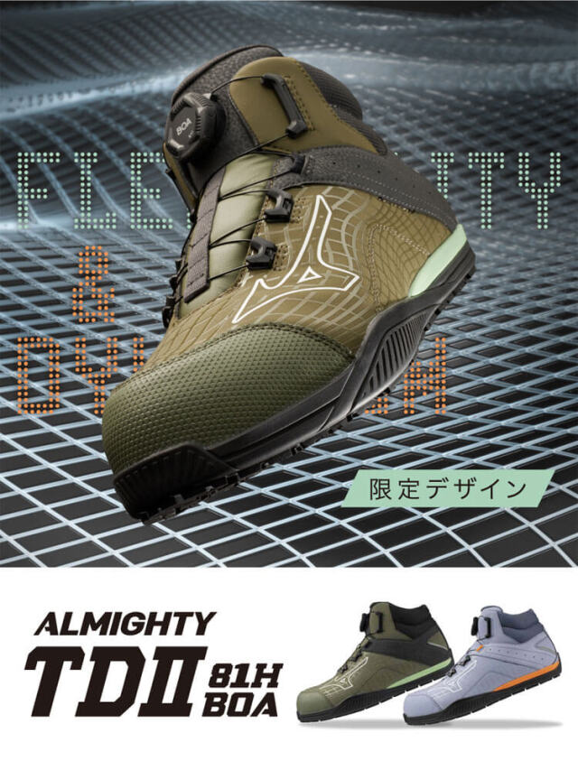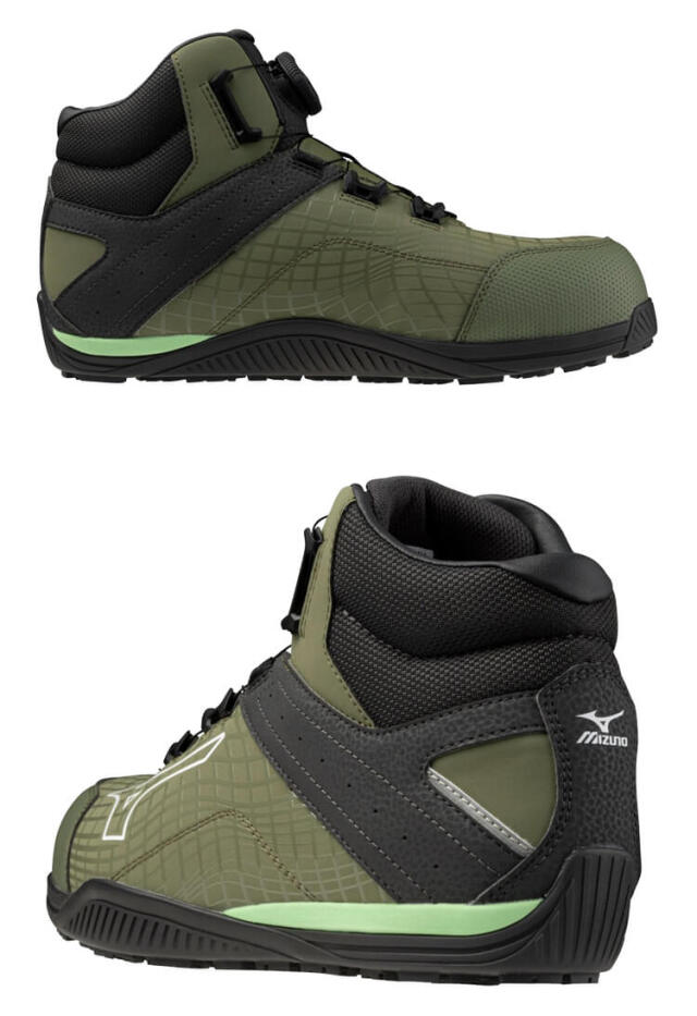 BOAフィットシステム L+1ダイヤルを搭載。ハイカットでも好みに応じたフィット感を自在に調整可能。 アッパーには人工皮革を幅広く採用して防塵性を高め、タフとフィット感の両立を実現しました。 素足感覚で履けるDIIソールは、かかと部分に高反発と柔らかさを両立 させたMIZUNO ENERZYを採用。 ソール形状と細部にまでこだわったデザインが絶妙にマッチした、スマート&タフなハイカット。