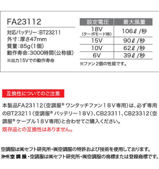 注意:18V専用ファンFA23112をご使用になる場合は必ず対応バッテリーBT23211、対応ケーブルCB23311、CB23312をご使用ください。