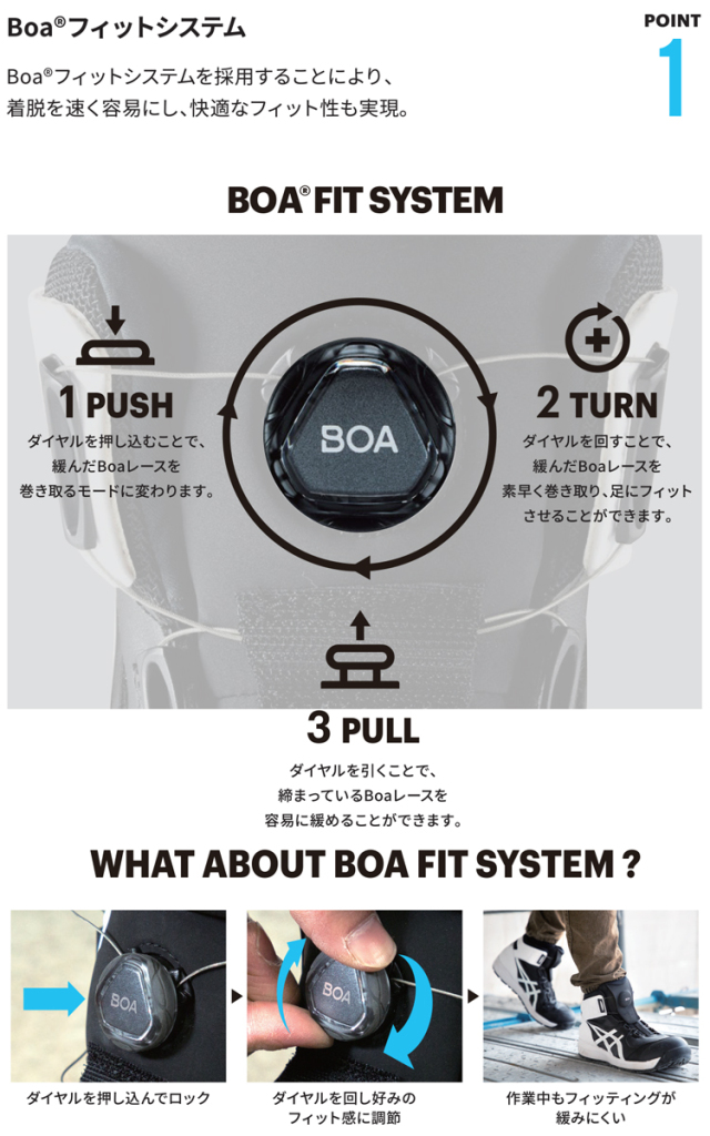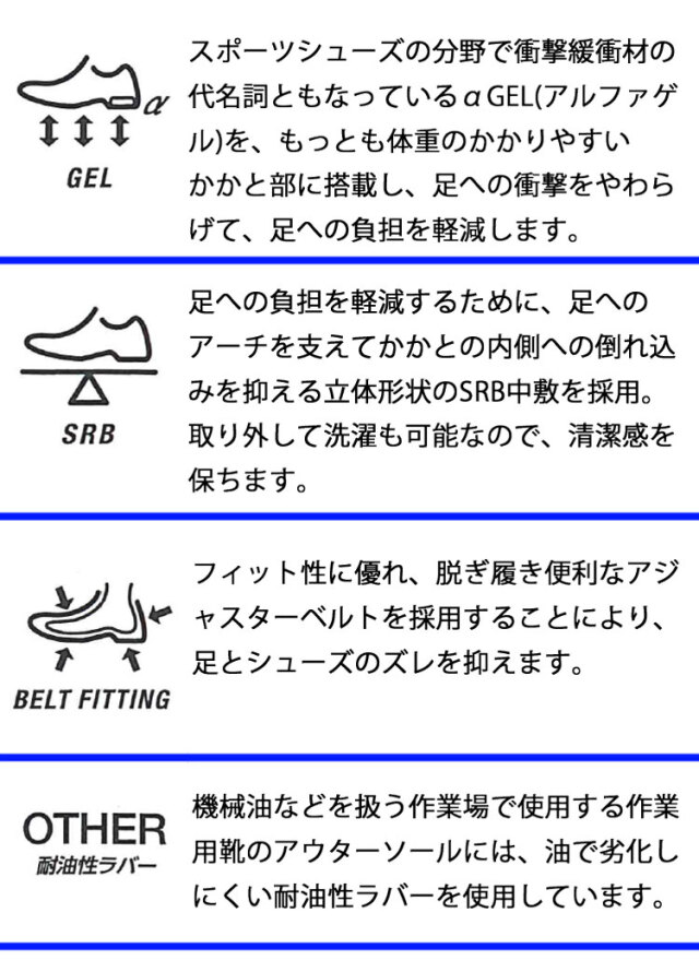 JSAA規格A種認定品。A種先芯を使用。Boaフィットシステムを採用。着脱を速く容易に。ワイド(3E相当)設計のスニーカータイプ。スタイリッシュなスニーカーデザイン。バックカウンター再帰反射材を搭載。