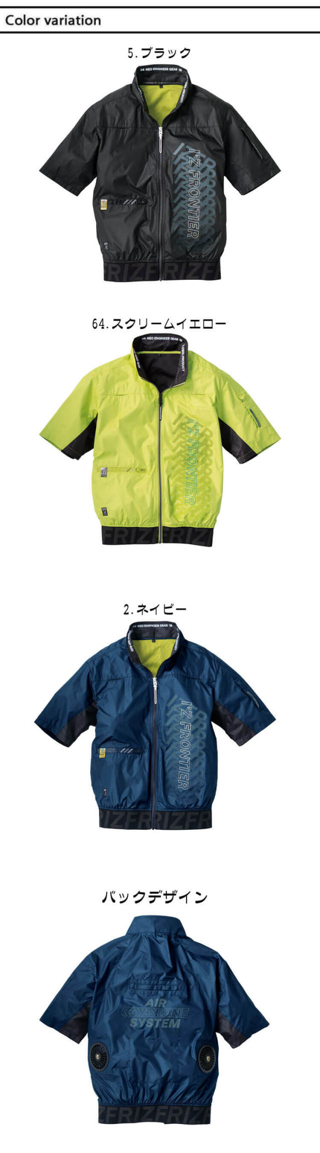 アイズフロンティア 10215シリーズ エアーサイクロンシステムのページです。人気作業服メーカーのアイズフロンティアのEFウェアを販売しております。アイズフロンティアが表現するリッチなユーロテイストの世界観が、ワークシーンに異彩を放ちます。大胆に施された先進性高いロゴプリントやジャガード柄を表現した裾帯ゴム、ロゴプリント止水ファスナー等計算しつくされた様々なデコレーションが更なるファッション性アップを実現しました。アイズフロンティアの商品全バリエーション取り揃え、最短翌日発送のミチオショップ。暑さ・熱中症対策と節電の両立を目指して、ファン付き作業着、バッテリー、ファン、インナー、付属品まで全て取り揃えております。