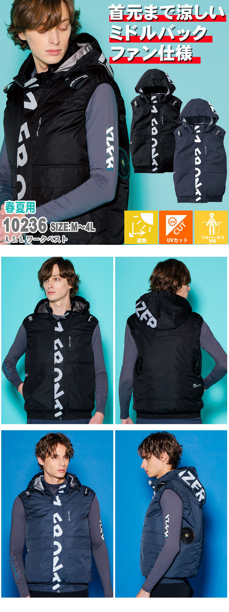 10236 ワークベストと32V対応のA.S.S.ファン 90022と専用設計のA.S.S.バッテリー 90023を組み合わせた、ハイパワー仕様のセットです。ミドルバックファン仕様による優れた風抜けと、裏アルミコーティング素材による遮熱性を兼ね備えた一着。フルハーネス対応の大型フードや大容量ポケットなど、現場で求められる実用性を備えながら、ストリート感あふれるルックスで個性も演出します。アイズフロンティアの商品全バリエーション取り揃え、最短翌日発送のミチオショップ。暑さ・熱中症対策と節電の両立を目指して、ファン付き作業着、バッテリー、ファン、インナー、付属品まで全て取り揃えております。