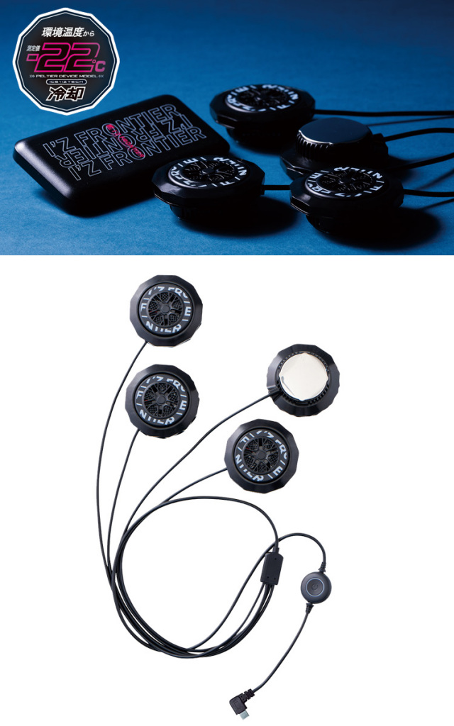4個付きペルチェクールデバイスの販売ページです。デバイスの接触部位は電源を入れ約10秒で環境温度より最大マイナス約22度のハイレベルな冷却機能を発揮します。動脈を冷やす事により効果的に身体全体をクールダウンさせ、猛暑時の疲労軽減を促します。アイズフロンティアの商品全バリエーション取り揃え、最短翌日発送のミチオショップ。暑さ・熱中症対策と節電の両立を目指して、ファン付き作業着、バッテリー、ファン、インナー、付属品まで全て取り揃えております。