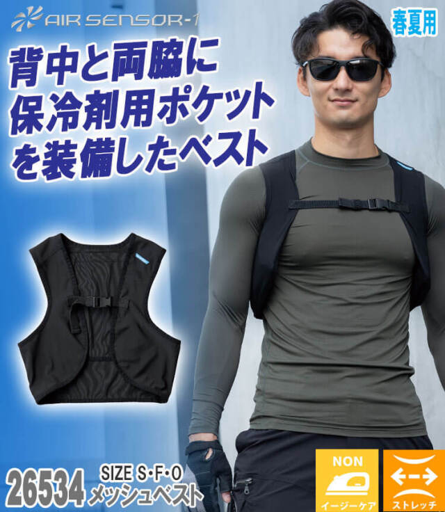 クロダルマ エアーセンサー1 26534 メッシュベストの単品のページです。洗い替えにお勧めです。背中、両脇下に計3つの保冷剤ポケットを配置したメッシュベストです。レジャー、アウトドアなどシーンを選ばずご着用いただけます。土木・建設・建築・工務店、製造、工場・電気工事・設備、農業・農園・造園・運送・倉庫・軽作業、ビルメンテナンス・清掃・食品工場・飲食店、ウォーキング・ガーデニング・アウトドア・レジャー・イベント・スポーツ観戦・フェス・学生・学校などあらゆるシーンで活躍できます。クロダルマの商品全バリエーション取り揃え、最短翌日発送のミチオショップ。暑さ・熱中症対策と節電の両立を目指して、アイスベスト、保冷剤、付属品まで全て取り揃えております。